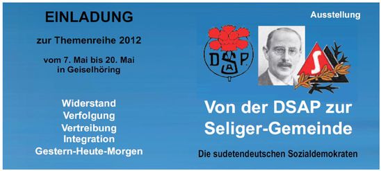 „Die bewegte Geschichte aufrechter Kämpfer. Für Demokratie und gegen Faschismus. Für Völkerverständigung, gegen Nationalismus und Ignoranz“, so fasst Karl Garscha vom Bundesvorstand der Seliger-Gemeinde die Inhalte der Ausstellung „Die Sudetendeutschen Sozialdemokraten - Von der DSAP zur Seliger-Gemeinde“ zusammen, die am kommenden Montag, den 7. Mai um 19.30 Uhr im Pfarrsaal der evangelischen Kirche in Geiselhöring eröffnet wird. Karl Garscha führt persönlich durch die Ausstellung und stellt sich den Fragen der Besucher.
