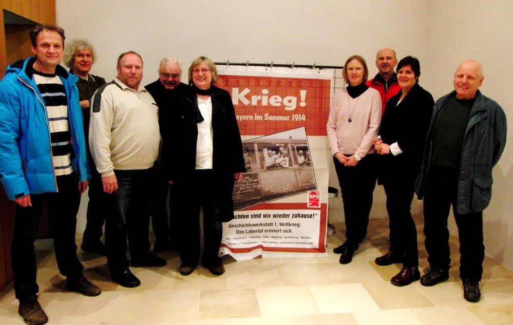 Freuten sich über die vielen interessanten Fundstücke die bei der Geschichtswerksatt 1. Weltkrieg gezeigt wurden. (v.l.) Ernst Roth, Franz Graf, AK-SprecherRainer Pasta, Martin Auer, Archivarin Karin Hagendorn, Ortsvorsitzende Madlen Melzer, Robert Merl und Kirsten Reiter (beide SPD Langquaid) sowie Gerhard Schneider