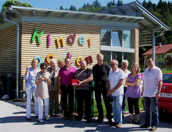Vor dem Passivhaus-Kindergarten in Schneegattern: die Besucher aus Geiselhöring, Mallersdorf-Pfaffenberg, Schierling, Langquaid und Regenstauf mit BGM Erich Rippl (5. v.l.)