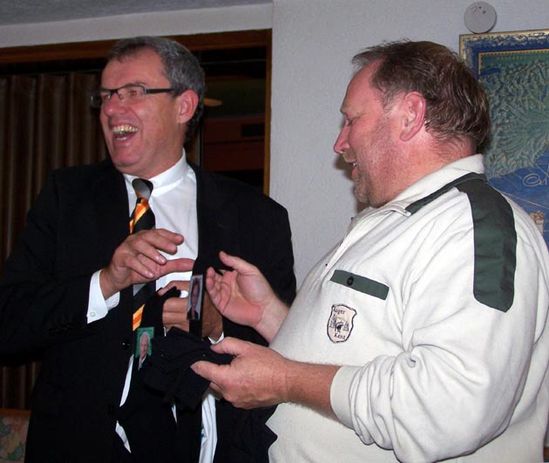 Arbeitskreissprecher Rainer Pasta überreicht MdL Joachim Werner das Trainings-Set