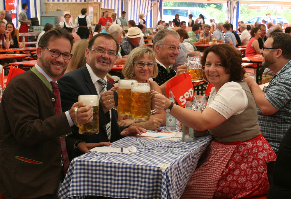 Lassen sich die erste Maß im Festzelt munden: (v.l.) Florian Pronold, Jörg und Kerstin Vogelsänger sowie Ruth Müller (vorne re.) mit Fritz Fuchs und Robert Pfannenstiel