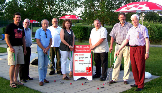 „Gemeinsam sind wir stark“ – Politik beim Minigolf: Vertreter der SPD-Ortsvereine Neufahrn, Mallersdorf-Pfaffenberg, Geiselhöring und Pfeffenhausen mit SPD-Bürgermeister Bernd Zauner (2.v.l.) und den Sprechern des AK Labertal, Ruth Müller und Rainer Pasta (Mitte).