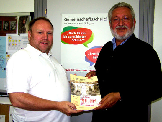 Rainer Pasta, Sprecher des SPD-Arbeitskreises Labertal, überreicht MdL Reinhold Perlak die druckfrische Dokumentation zum "Polenkinderlager 1944/45"