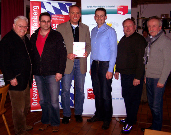Der stellvertretende Bezirksvorsitzende Peter Stranninger (3.vl.) informierte zum Konzept der Gemeinschaftsschule; mit dabei Martin Auer und Armin Buchner aus Schierling, AK-Sprecher Rainer Pasta aus Geiselhöring (2.v.re.) sowie SPD-Ortsvorsitzender Martin Kreutz und Heinrich Kaiser aus Mallersdorf-Pfaffenberg