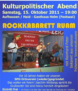 Den kulturellen Teil der Feier übernahm das Rockkabarett „Die Ruam“. Der Name leitet sich vom bayerisches Schimpfwort ( z.B. "Du Ruam Du") ab. Mit ihren großen musikalisches Repertoire und ihren musikalischen Fähigkeiten schafften sie es, trotz Problemen mit der Akustik, den Ortsverein und seine Gäste bestens zu unterhalten. Ihre neueste CD gab es im Anschluss gratis als Jubiläumsgeschenk für die Gäste.