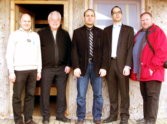 v.l. Gastwirt Xaver Holzer, Martin Auer, Ismail Ertug MdEP, Johannes Faden und Rainer Pasta vor den wenigen, besonders die bei Kindern und Jugendlichen beliebten Übernachtungshütten