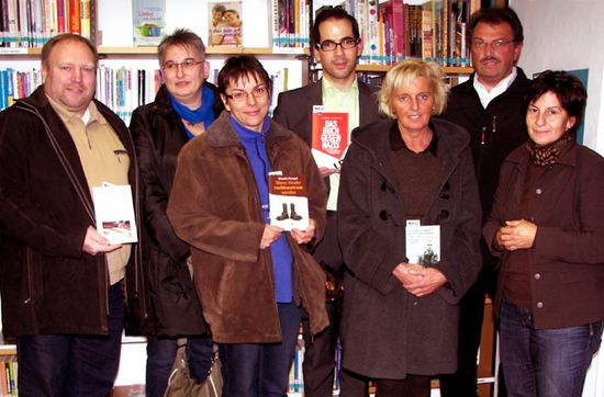 Rainer Pasta, Vera Wessely, Angela Ramsauer, Johannes Faden, Maria Reicheneder, Stadtpfarrer Josef Ofenbeck und Büchereileiterin Elisabeth Dengler (von links) bei der Übergabe der Bücher.