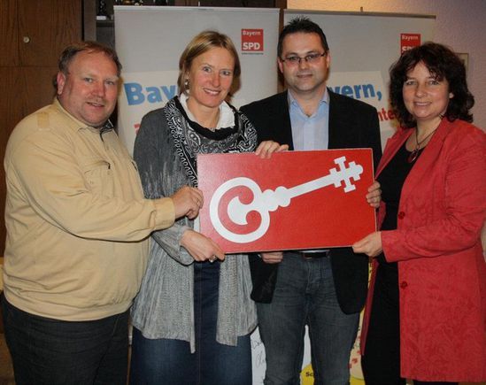 Nach dem Jahresabschluss des Arbeitskreises Großes und Kleines Labertal in Allersdorf kam der SPD-Ortsverein beim 15. Labertaler Dreikönigstreffen wieder zu neuen Ehren. Aus den Händen des Sprecher-Tandems Ruth Müller, Pfeffenhausen, und Rainer Pasta, Geiselhöring, erhielten die SPD-Ortsvorsitzende Madlen Melzer und Marktrat Armin Buchner symbolisch den Schlüssel für die virtuelle Geschäftsstelle des SPD-Arbeitskreises für die kommenden Wochen. „Um 14 Ortsvereine aus fünf Landkreisen zu koordinieren, braucht es eine entsprechende Organisationsstruktur. Der Arbeitskreis Labertal wäre nicht der Arbeitskreis Labertal, wenn wir hier nicht ein zeitgemäßes Instrument gefunden hätten, nämlich die virtuelle Geschäftsstelle“, erläuterte Arbeitskreis- Sprecher Rainer Pasta bei der Schlüsselübergabe. „Wie beim UN-Sicherheitsrat reichen wir abwechseln die Zuständigkeit für die virtuelle Geschäftsstelle an unsere Mitgliedervereine weiter, damit alle in die Organisation eingebunden sind und ihre Ideen und Themen einbringen können, erklärte die stellvertretende Arbeitskreis-Sprecherin Ruth Müller aus Pfeffenhausen, Markt- und Kreisrätin sowie SPD-Kreisvorsitzende Landshut-Land. „Damit können sich Mitglieder, vor allem aber auch Bürgerinnen und Bürger aus der Region über facebook einklinken und soziale und demokratische Politik mitgestalten,“ so Ruth Müller. Laut Madlen Melzer und Armin Buchner ist diese Aufgabe eine erneute Ehre für die Schierlinger SPD, nachdem sie bereits Anfang Dezember 2011 beim Bundesparteitag und der Wilhelm-Dröscher-Ausstellung den Arbeitskreis vertreten durften und einen dritten Preis ins Labertal holen konnten. Ihr Motto: „Auf ein neues! Gemeinsam im Labertal für unsere Bürgerinnen und Bürger arbeiten und schaffen, das macht Spaß und Freude.“