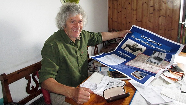 Franz Graf mit dem Gandorfer-Plakat zur Geschichtswerkstatt Erster Weltkrieg