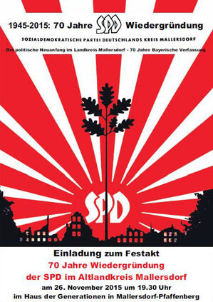 Am 26. November um 19.30 Uhr feiert die SPD im Labertal im Haus der Generationen in Mallersdorf-Pfaffenberg die Wiedergründung der Partei nach dem 2. Weltkrieg und den politischen Neuanfang. Mitte November 1945 beantragte die SPD im Landkreis Mallersdorf die Wiedergründung. In der Weihnachtswoche 1945 wurde diesem Antrag stattgegeben. Die Berichte zu den ersten Landräten in Mallersdorf spiegeln die politische und moralische Wirrnis der Zeit wieder.