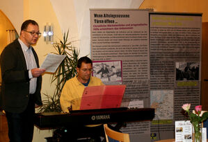 "Irgendwo auf der Welt gibt's ein kleines bisschen Glück...". Mit diesem Lied der legendären „Comedian Harmonists“ leiteten StD Gerhard Justwan und OStR Roland Diegritz musikalisch die Eröffnung der Ausstellung über die Flucht und Vertreibung der Evangelischen Christen und ihrer Ankunft in den Besatzungszonen der westlichen Alliierten durch die SPD-Landtagsabgeordnete Ruth Müller, MdL, und die SPD-Ortsvorsitzende Madlen Melzer im BRK-Seniorenheim Schloss Eggmühl ein. Die Wanderausstellung des SPD-Arbeitskreises Großes und Kleines Labertal gastierte auf ihrer Tour durch sechzehn Städte und Gemeinden zwischen Landshut, Straubing und Kelheim von Ende September bis kurz vor Weihnachten für fünf Tage auch in der Marktgemeinde. Ergänzt wird die Ausstellung der Evangelischen Kirche Westfalens durch Schautafeln über die aktuelle Flüchtlingssituation in der Region. Damit spannte sich der Bogen vom großen erzwungenen Auszug aus der geliebten Heimat vor 70 Jahren bis zum Exodus von Millionen von Afrika und Nahem Osten nach Europa.