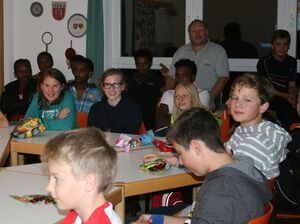 Beim Filmabend zu den "Comedian Harmonists": Rainer Pasta mit der Konfirmantengruppe der Kreuzkirche und einigen Asylbewerber
