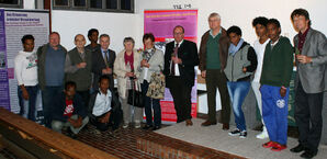 Für Gäste und Zeitzeugen gab es, als Erinnerung an die Comedian Harmonists, einen „kleinen grünen Kaktus“: Pfarrer Ulrich Fritsch (re.) und AK Sprecher und Rainer Pasta (2.v.li) mit Bürgermeister Herbert Lichtinger (6.v.re.), Helga Ohneis und Ruth Metzger (7.u.8.v.re), Manfred Mletzko und Eduard Neuberger (3.u.5.v.li.) sowie Horst-Falko Bilek (5.v.re.) und die eritreischen Flüchtlinge in Geiselhöring.