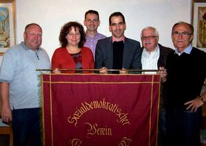 Sammelten sich hinter der Traditionsfahne der Geiselhöringer SPD: (v.l.) Rainer Pasta, Sprecher des SPD-Arbeitskreises Labertal, die neugewählte Landtagsabgeordnete Ruth Müller, Kreisvorsitzender Martin Kreutz, Ortsvereinsvorsitzender Johannes Faden sowie die Stadträte Josef Eisenhut und Harry Büttner