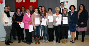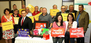 Die Bundestagskandidaten Johanna Uekermann (vorne, 2.v.re.), Anja König (vorne re.) und Dr. Tobias Hammerl (vorne 2.v.li.) mit Bürgermeister Peter Forstner (re.), den Landtagsabgeordneten Ruth Müller (li) und Johanna Werner-Muggendorfer (verdeckt) sowie den Vertretern der Ortsvereine um die AK-Sprecher Rainer Pasta (Mitte) und Karin Hagendorn(2.v.li.)