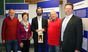 Vera Aßmann und Hans-Joachim Otte aus dem SPD-Ortsverein Gröbenzell holten sich das Friedenslicht aus Bethlehem und Informationen zur „Ausstellung Schuld& Sühne?“ von stellvertretendem Schulleiter Sebastian Brandl (Mitte), AK-Sprecher Rainer Pasta (2.v.re.) und Dr. Christoph Bachmann, Leiter des Staatsarchivs München ab.