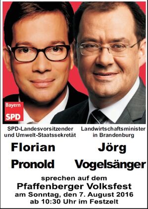 Am Sonntag, den 7. August, um 10.30 spricht der brandenburgische Landwirtschaftsminister Jörg Vogelsänger sowie Staatssekretär Florian Pronold beim politischen Frühschoppen im Festzelt Pfaffenberg.