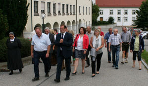 Auf dem Rundgang durch das Klostergut (v.l.) Generaloberin S. M. Jakobe Schmid, Landwirtschaftsverwalter Wolfgang Obermeier, Superior Dr. Wilhelm Gegenfurtner Landwirtschaftsminister Jörg Vogelsänger, Ruth Müller, MdL, und Kerstin Vogelsänger mit Gemeinderäten und Vertretern der SPD