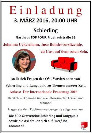 „Wahnsinnig interessant“ fand die Langquaider SPD-Vorsitzende Kirsten Reiter in ihrem Schlusswort die über 100 Minuten dauernde Gesprächsrunde auf der„roten Couch“ mit der Bundesvorsitzenden der Jungsozialisten Johanna Uekermann. Der gleichen Meinung waren die Besucherinnen und Besucher der Veranstaltung im Restaurant „Top Four“, zu der anlässlich des Internationalen Frauentages die beiden SPD-Ortsvereine Schierling und Langquaid sowie die AsF Langquaid eingeladen hatten.