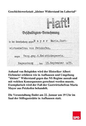 Der letzte „Historische Themennachmittag“„GELINZT - Euthanasie- Opfer aus dem Labertal“ fand am 4. März in Geiselhöring statt. Das Thema wurde mit einer Informationsfahrt am 14. April an den Gedenkort Hartheim bei Linz abgerundet.