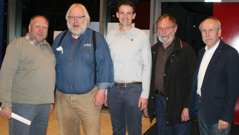 Rufen zur Wahl um den Landesvorsitzend auf: Kreisvorsitzender Martin Kreutz (Mitte) mit den Vertretern der Ortsvereine aus Geiselhöring, Rainer Pasta (li.), St. Englmar, Hannes Forster (2.v.li.), Straßkirchen, Eduard Grotz (2.v.re.) und Mallersdorf-Pfaffenberg, Heinrich Kaiser (re.)
