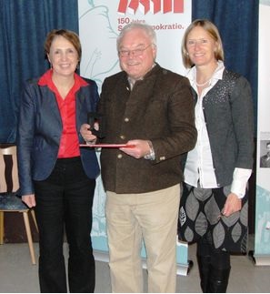 Hohe Auszeichnung für sein langjähriges und unermüdliches Wirken für die sozialdemokratische Idee: Martin Auer erhält aus der Hand der stellvertretenden Landesvorsitzenden Annette Karl die Willy- Brandt- Medaille.